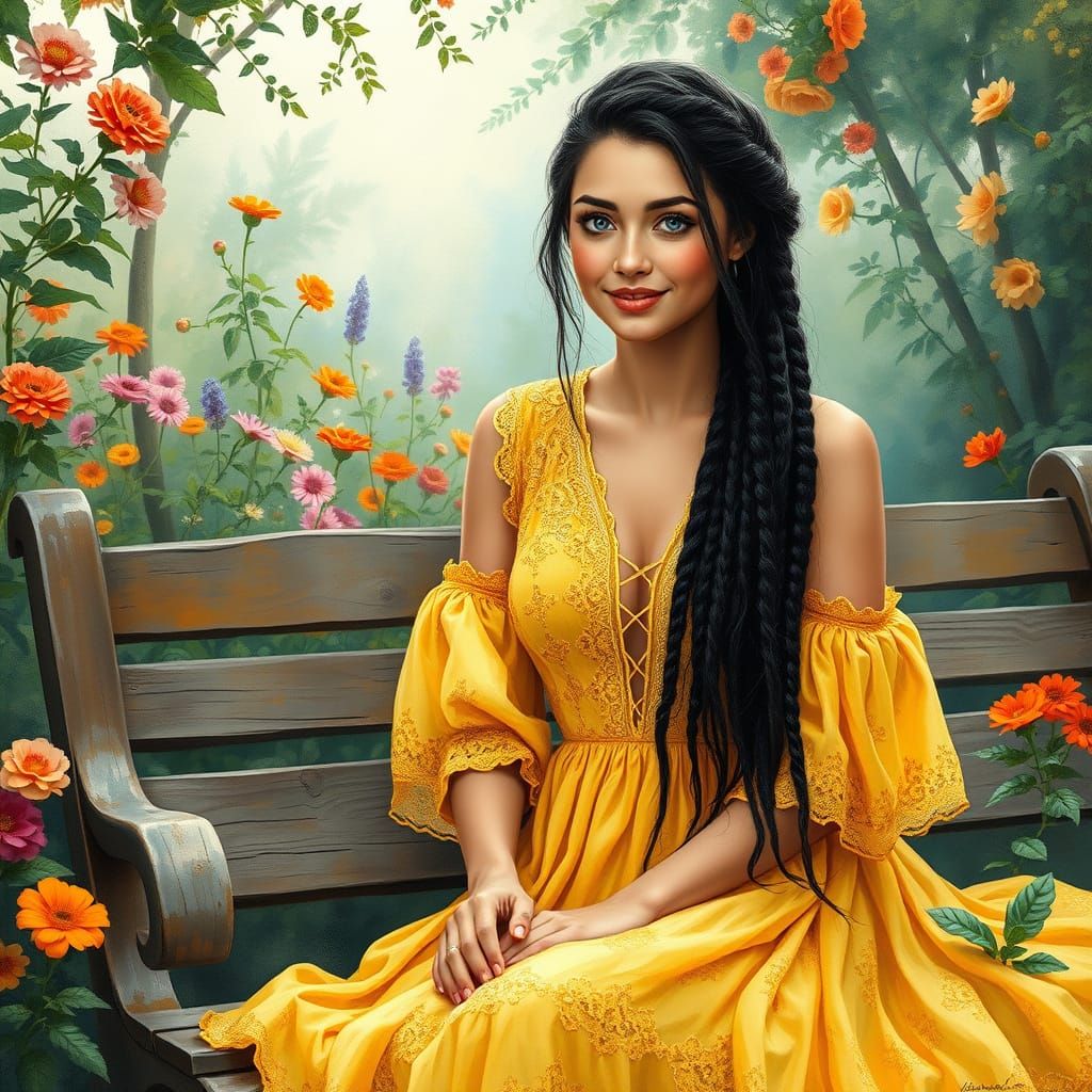 Lovely woman seated on a rustic wooden bench in a lush garden, black braid hair cascading down, blue eyes sparkling, soft smile, wearing a flowing yellow dress, boho, lace,,......., in Gouache Style, Watercolor, Museum Epic Impressionist Maximalist Masterpiece, Thick Brush Strokes, Impasto Gouache, thick layers of gouache watercolors textured on Canvas, 8k