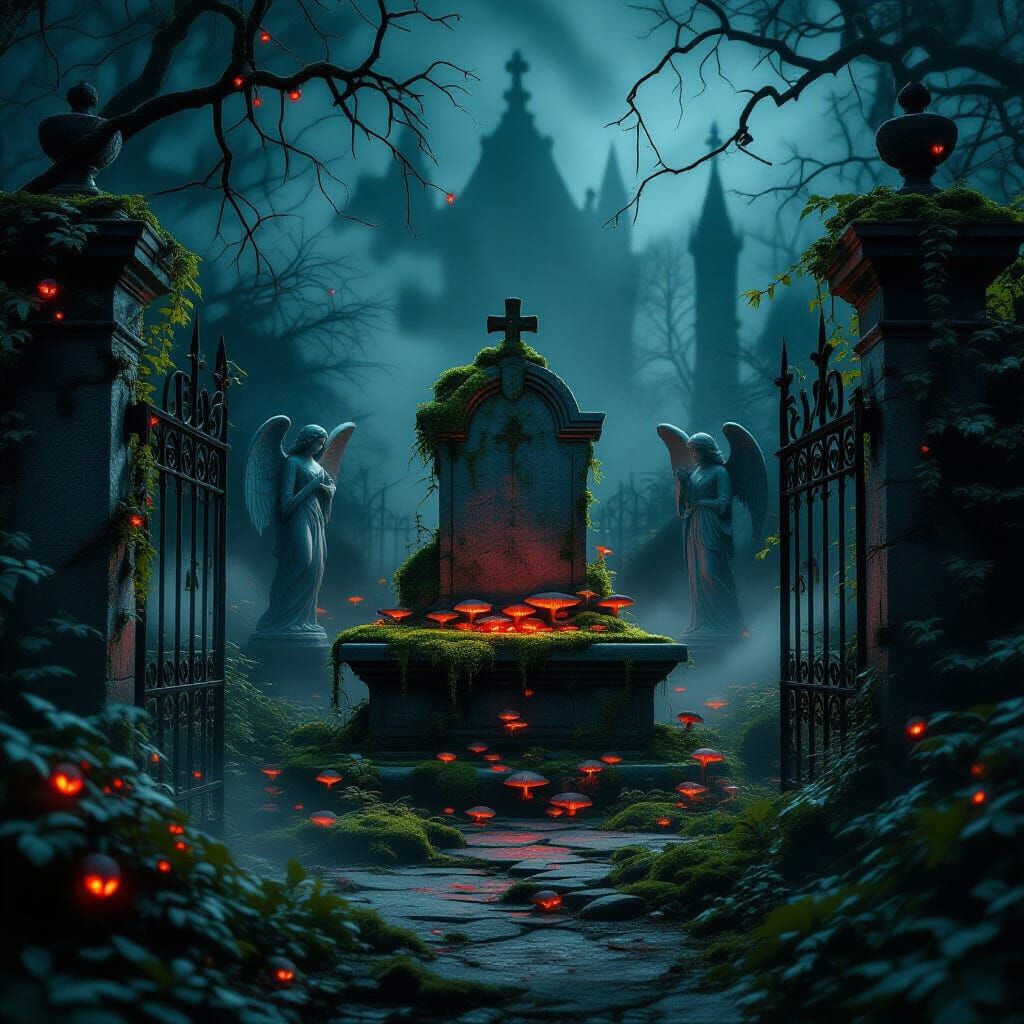 This image shows a gothic horror fantasy scene of an overgrown garden at night. A cracked altar is covered in moss and glowing fungi, with fog swirling around broken statues.