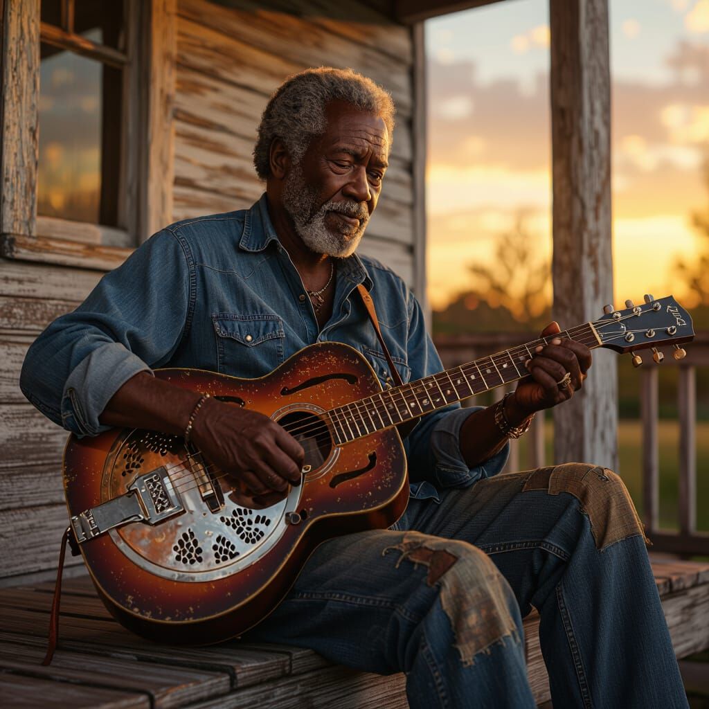 This image shows an elderly blues musician playing a resonator guitar on a weathered porch. The warm, golden light of the setting sun creates a detailed matte painting with deep, complementary colors.