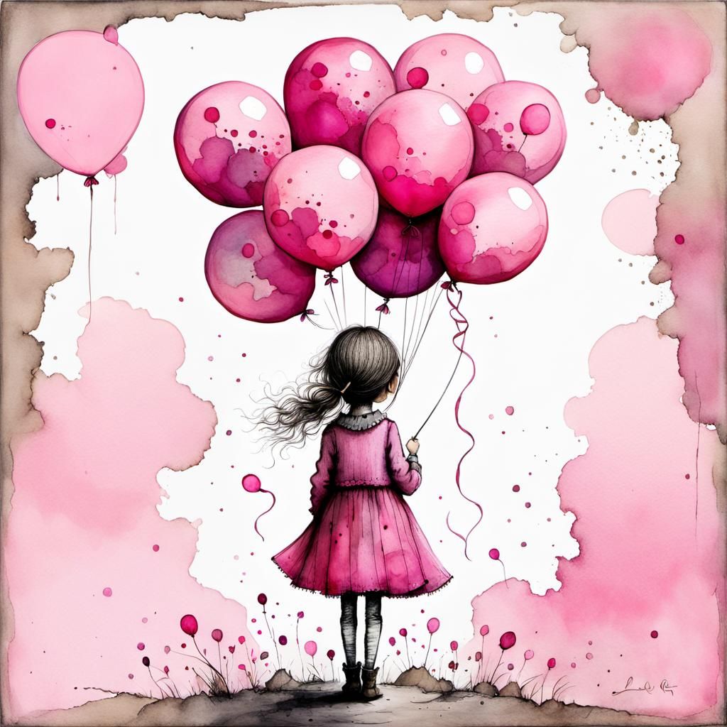 A whimsical illustration of a small girl in pink holding pink balloons. The image features a limited color palette of pink shades, with an alcohol ink aesthetic.
