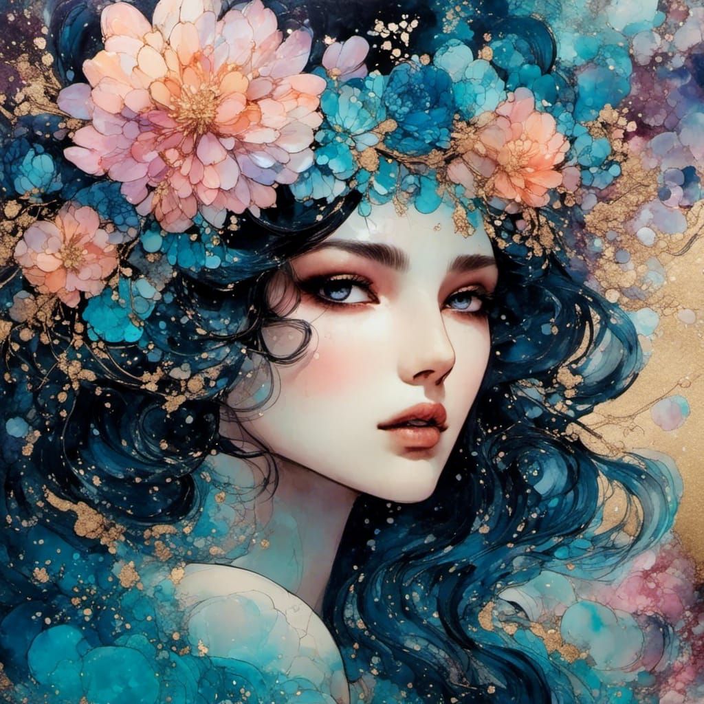 This image shows an elegant woman in an art deco style, set against a vibrant floral backdrop. The artwork blends holographic and astral elements with the aesthetic of Ukiyo-e in mixed media.