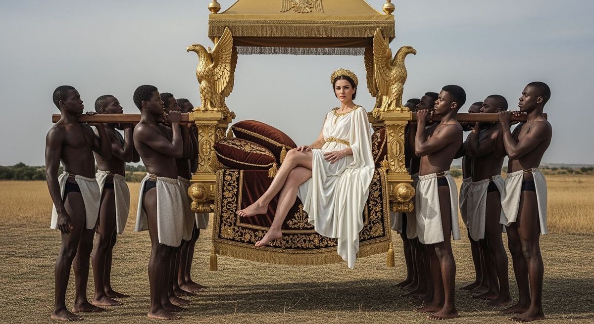 This image shows a Roman Empress sitting regally on her golden litter throne. Ten Black servants carry the throne. The scene is photorealistic with sharp focus, soft lighting and a shallow depth of field.