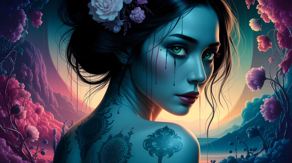 A close-up full frame portrait captures the ethereal beauty of a Japanese woman, her flawless skin glowing under a soft, eerie light. Her emerald green eyes seem to hold secrets of another world, and she is covered and dripping in various colors of paint. Intricately tattooed Japanese symbols adorn her ...