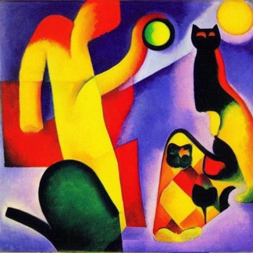 A vibrant painting of a glowing cat. The artwork features bold colors and abstract forms reminiscent of early 20th-century expressionist and post-impressionist styles.