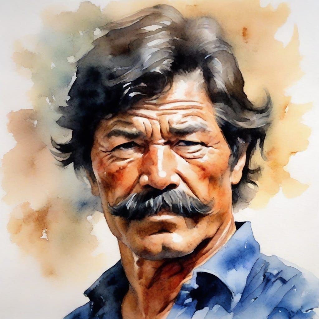 This image shows a watercolor portrait in an impressionistic style, depicting a weathered man with a Fu Manchu mustache and an open-collared shirt, evoking a retro aesthetic.