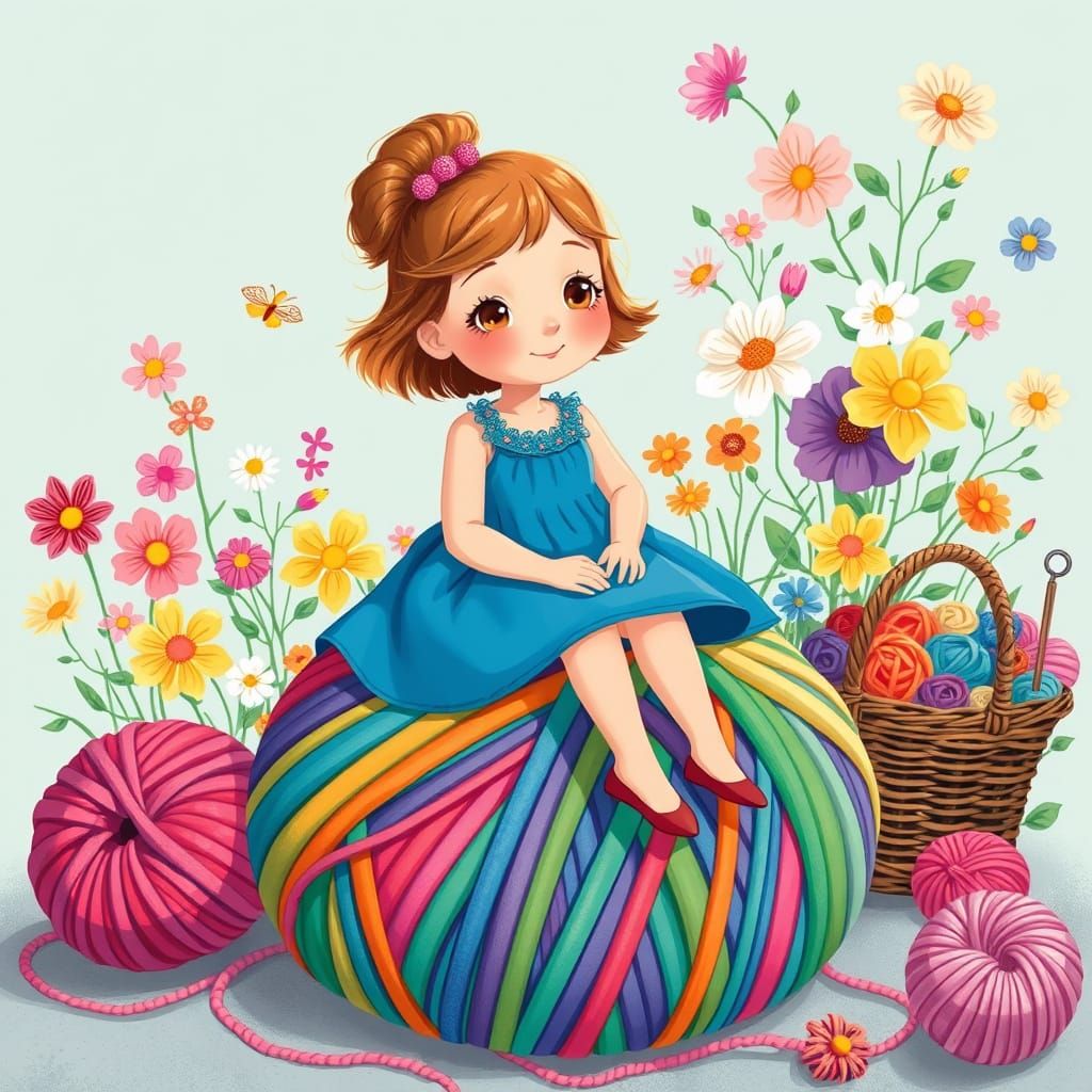 A charming image showing a girl in a blue dress seated on a colorful yarn ball, amidst flowers and crafting items. Rendered in a whimsical cartoon style.