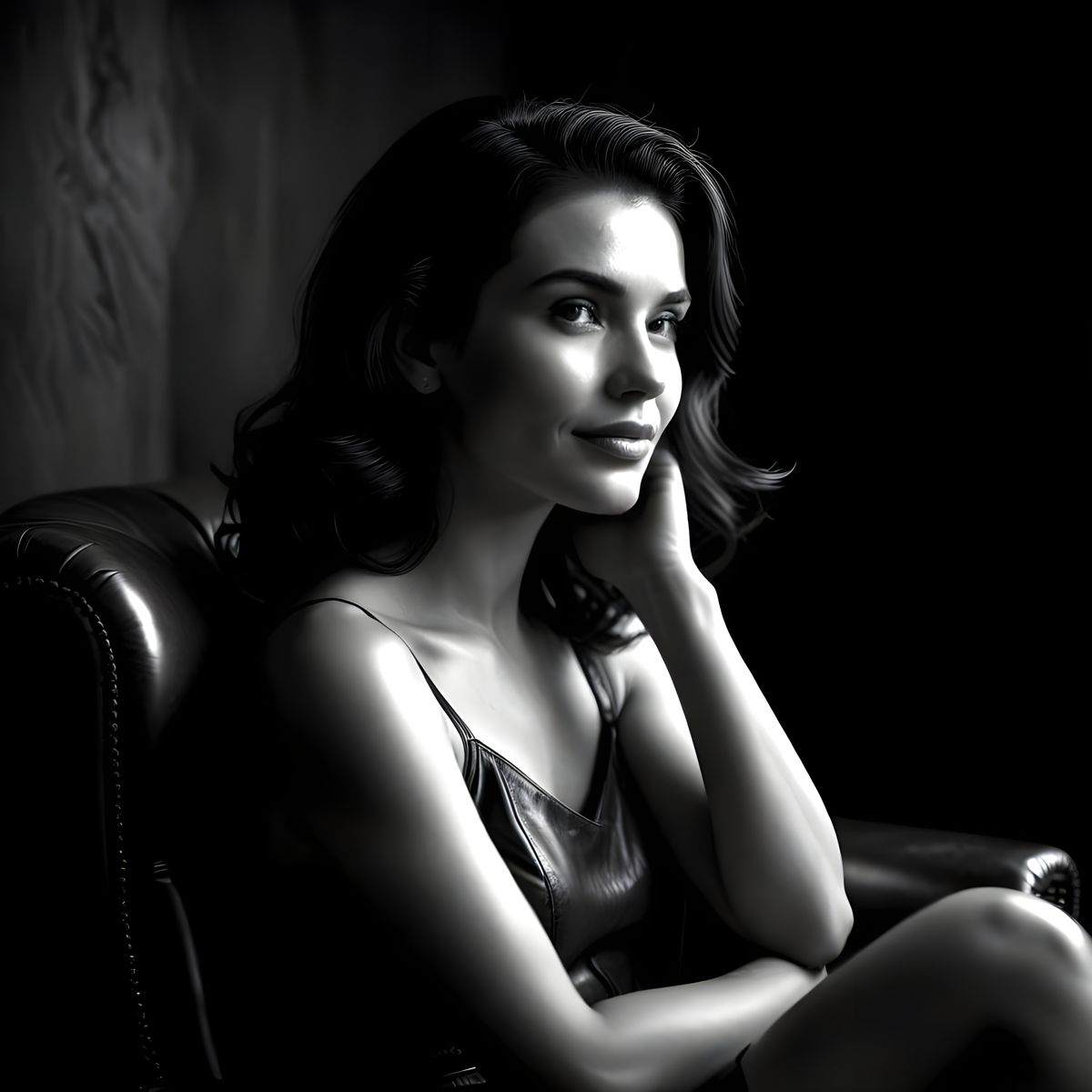 This image shows a 1960s-style black and white photograph of a confident young woman relaxing in a worn leather armchair. Shot with a shallow depth of field, the photo evokes a cozy, casual atmosphere.