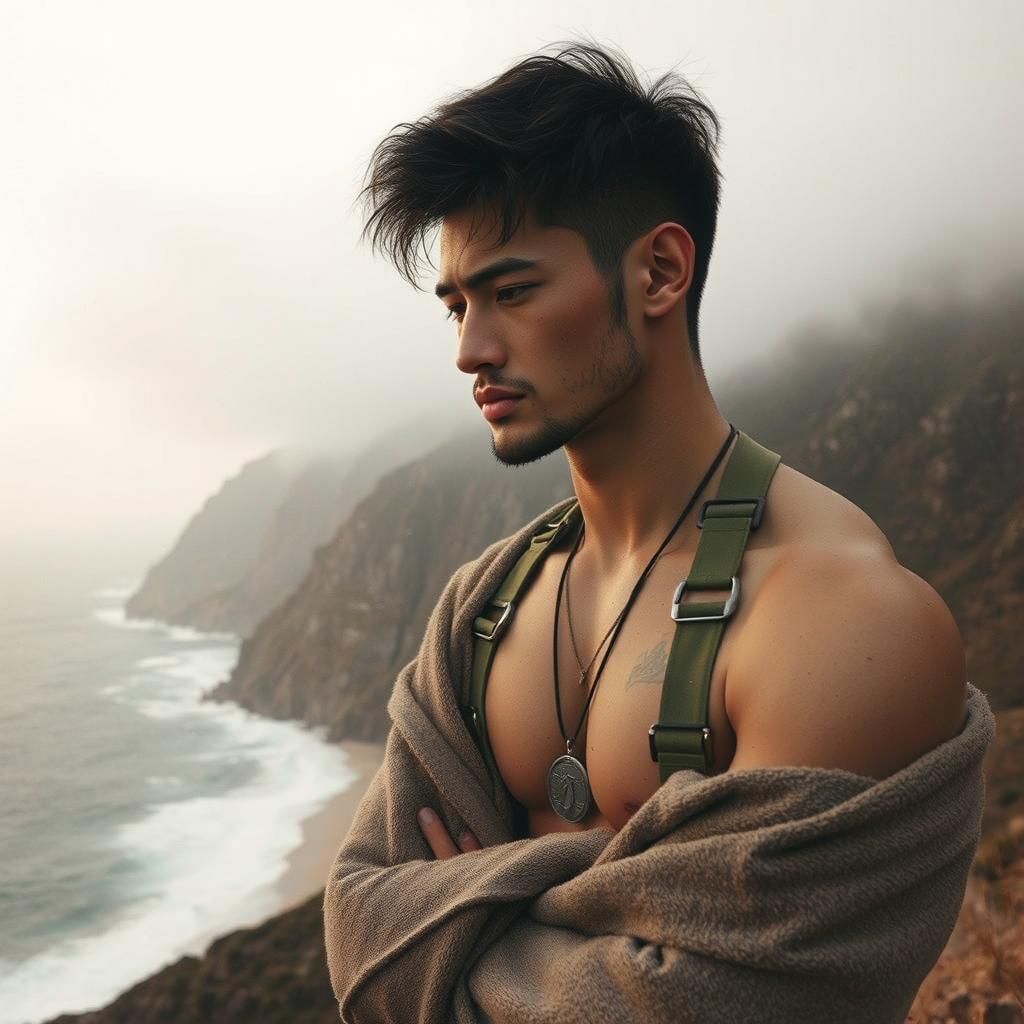 This image shows a young Chinese swimmer with short hair on a seashore. The swimmer is looking down with arms wrapped around their body, shivering in the cold wind in this nostalgic, ethereal photograph.