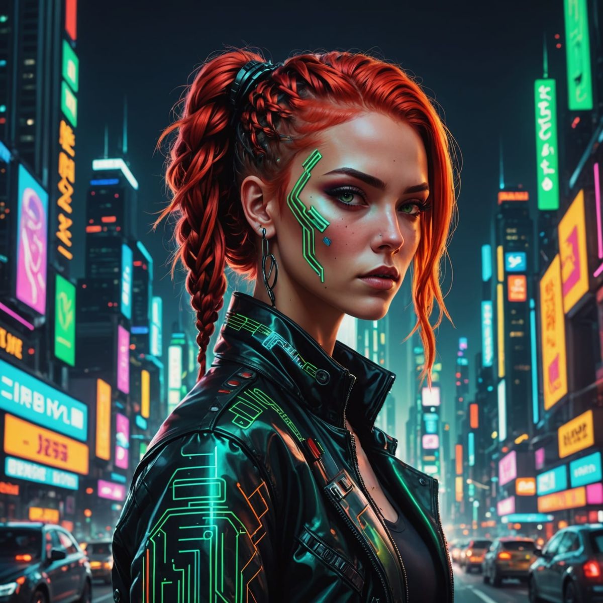 This image shows a cyberpunk woman with red and green braided hair and neon piercings. The subject wears a black leather jacket with circuitry patterns and is set against a futuristic cityscape. The image has a gritty, high-tech aesthetic.