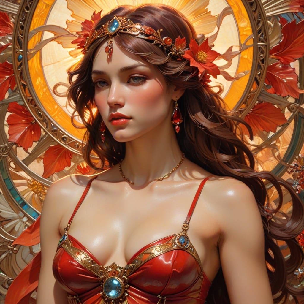 This vibrant oil painting features a tanned, curvy woman in a red thong and jewelry, illuminated by warm light. Lush brushstrokes highlight her form and the opulent details.