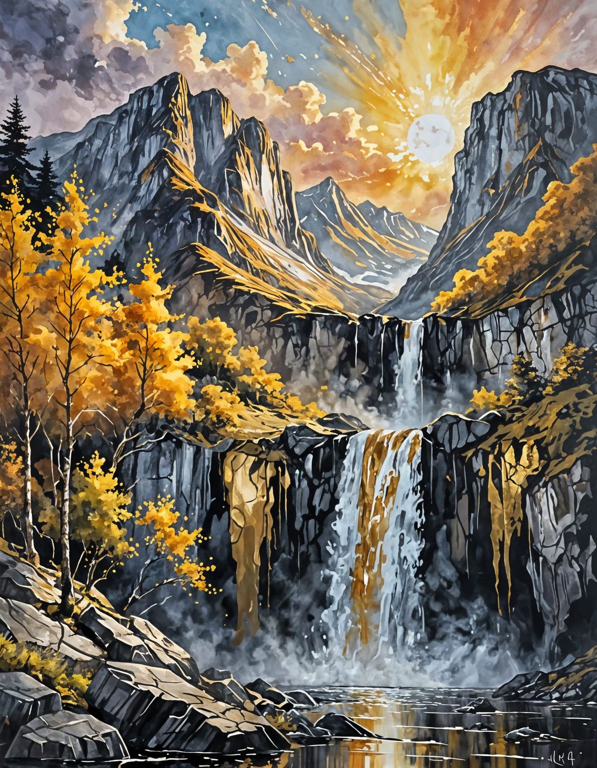 This image shows a breathtaking mountain waterfall scene in a rich, golden light, reminiscent of a traditional oil painting with vibrant, colourful brushstrokes.