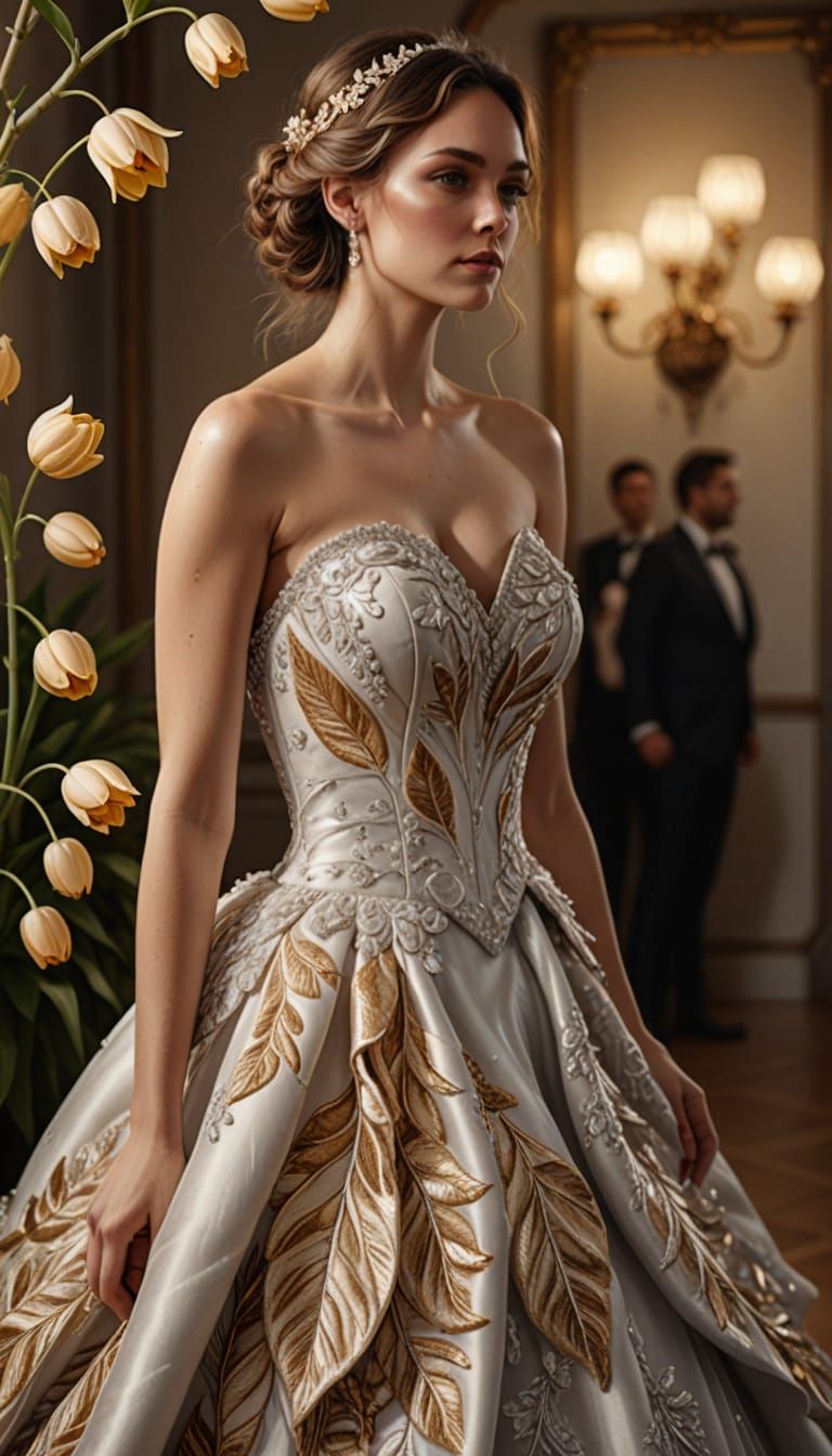 This image shows a woman in a strapless wedding dress with a silver top and a puffy, ruffled tulip skirt. The digital art features embroidered golden leaves and sparkling silver threads, rendered with soft, warm lighting.