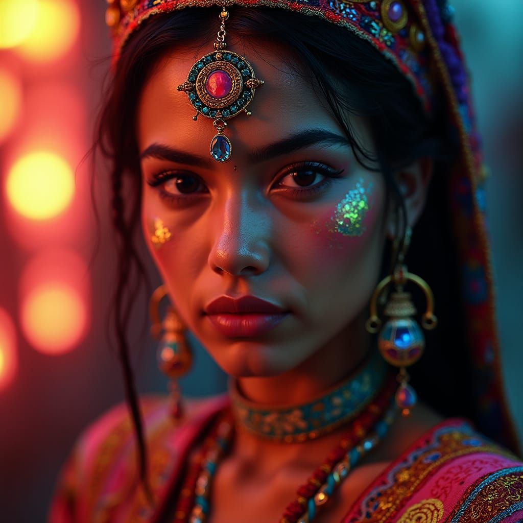 This stunning portrait combines traditional Aztec Mexican clothing with futuristic jewellery, evoking the feeling of a high-end film still with a vibrant, hyperrealistic color palette and cinematic lighting.