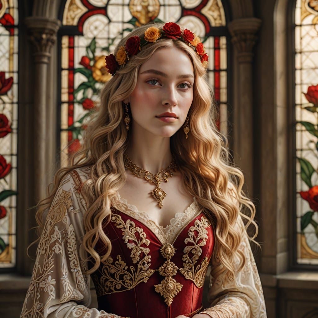 This stunning portrait depicts a young woman in a Renaissance-style dress, surrounded by an ethereal atmosphere and warm golden lighting. The soft focus and intricate textures evoke a dreamy, fantasy-like quality, blending historical and medieval elements with rich colors and ornate details.