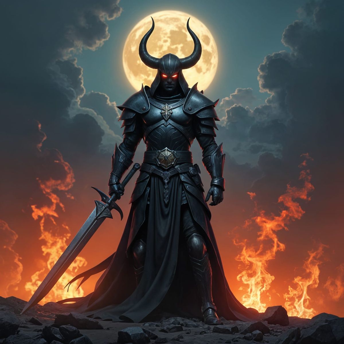 This image features the inscription HORRUS in a gothic style, set against a backdrop of flames and a fiery, dramatic sky.