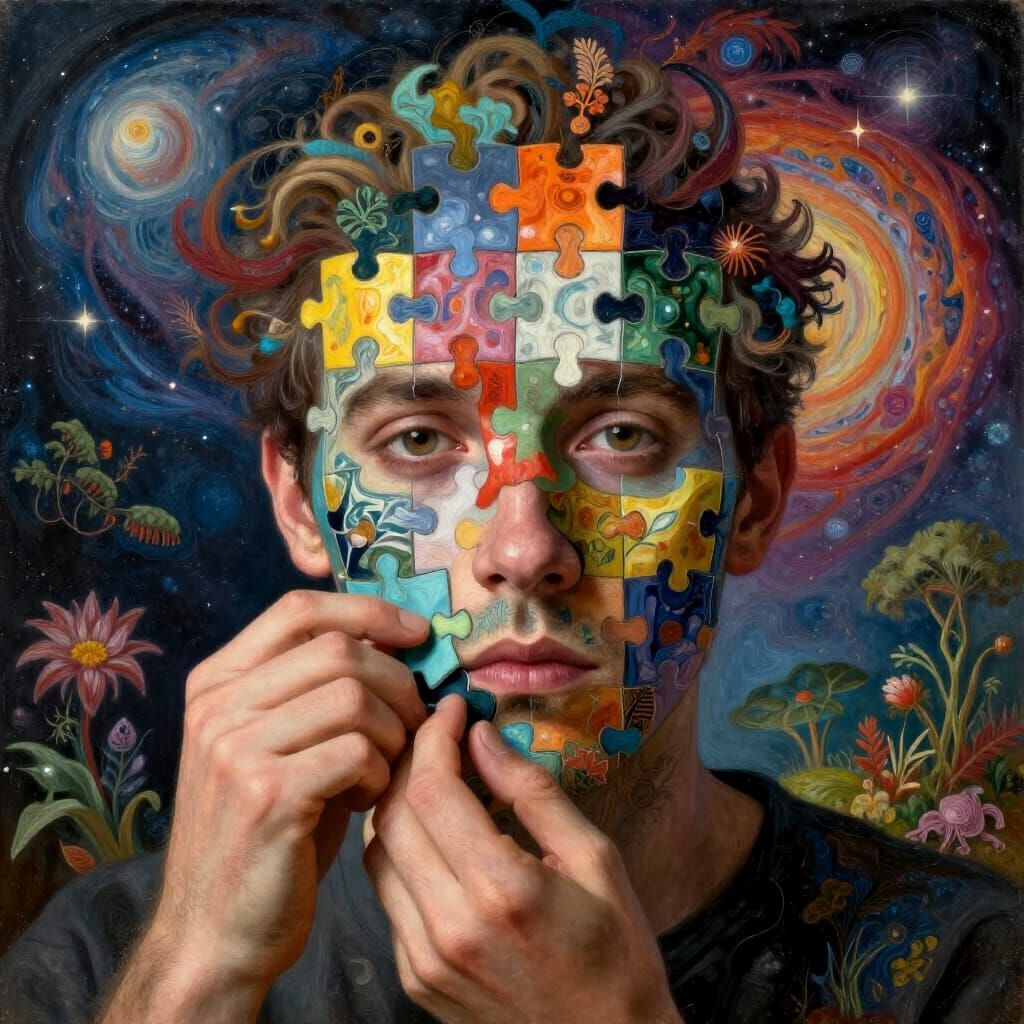 This image depicts a man constructing a vibrant, fragmented face from diverse puzzle pieces. It features cosmic surrealism, intricate bio-art, and organic patterns in a highly detailed 8k resolution.