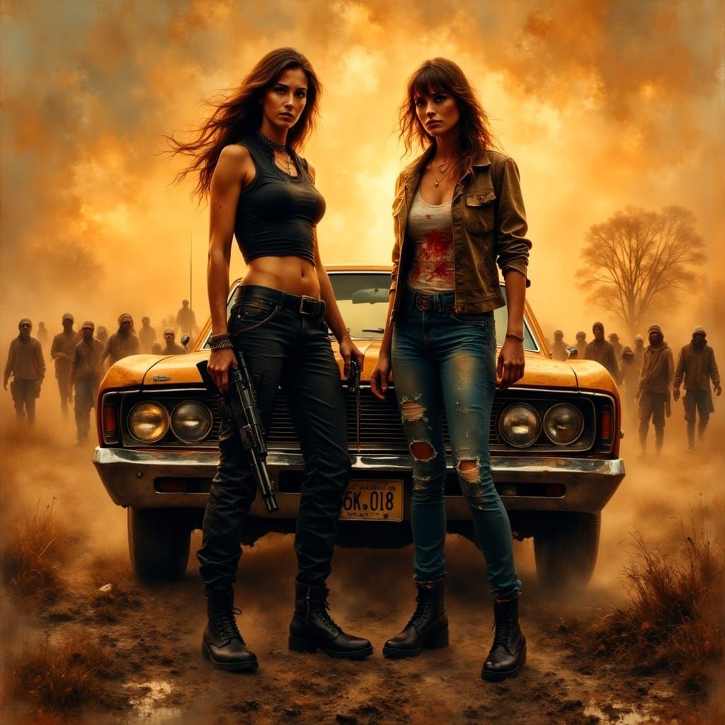 This image shows two women prepared for battle against a zombie horde in a post-apocalyptic dusk scene. The women are armed and ready near a classic car, rendered with gritty realism.