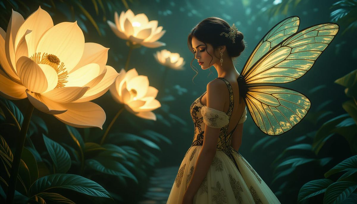A striking picture of a woman with bee wings in a surreal garden. The figure, with a human-insect face, wears an ornate gown amid glowing flowers, shot with high contrast lighting.