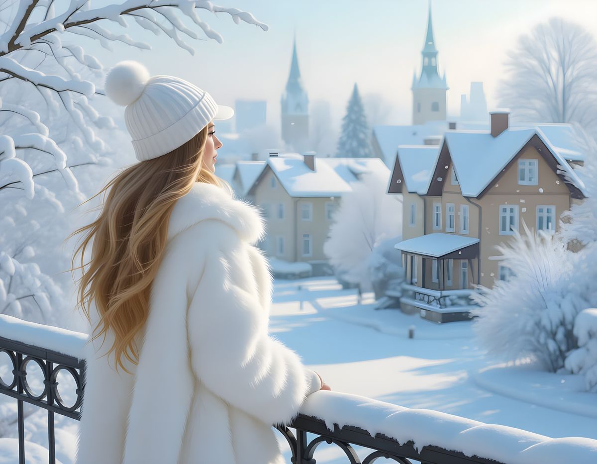 This image features a graceful woman with blonde hair admiring a snow-covered city. The art blends impressionistic and ink drawing styles with soft mist, bright lighting, and bokeh effects.