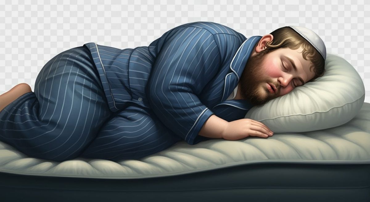 This image shows a young Hasidic man sleeping on an air mattress. He is lying on his side in striped pajamas, with his kippah askew and sidelocks cascading around him. The artwork has a digital illustration style.