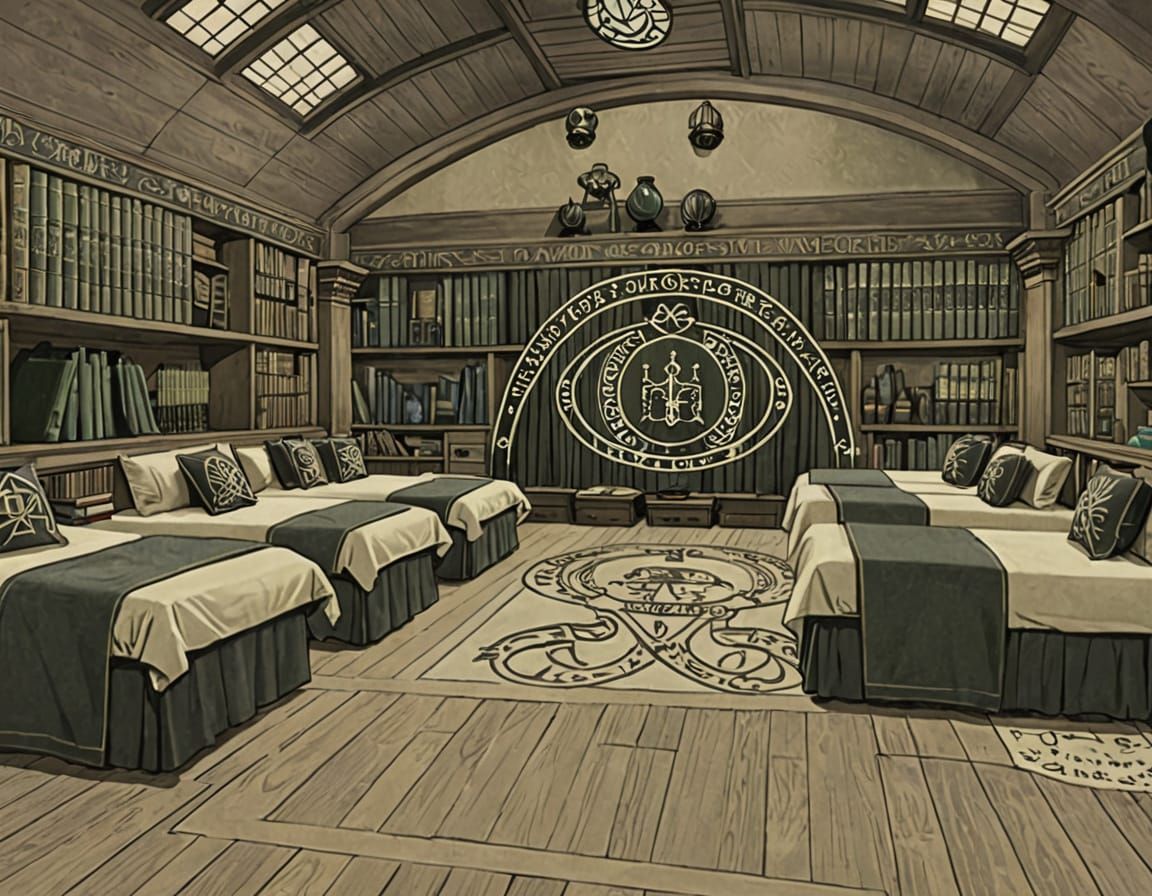 This image shows a photorealistic communal bedroom, recreated by AI from a detailed textual description. The bedroom scene is richly detailed.