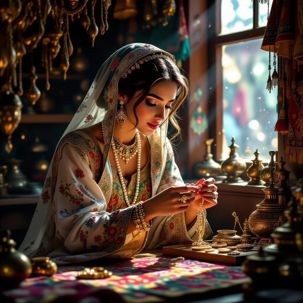 This image shows a young woman in traditional Baghdad clothing, circa 1800s, closely inspecting a pearl bracelet. The scene is evocative, rendered in a detailed, emotionally rich concept art style.