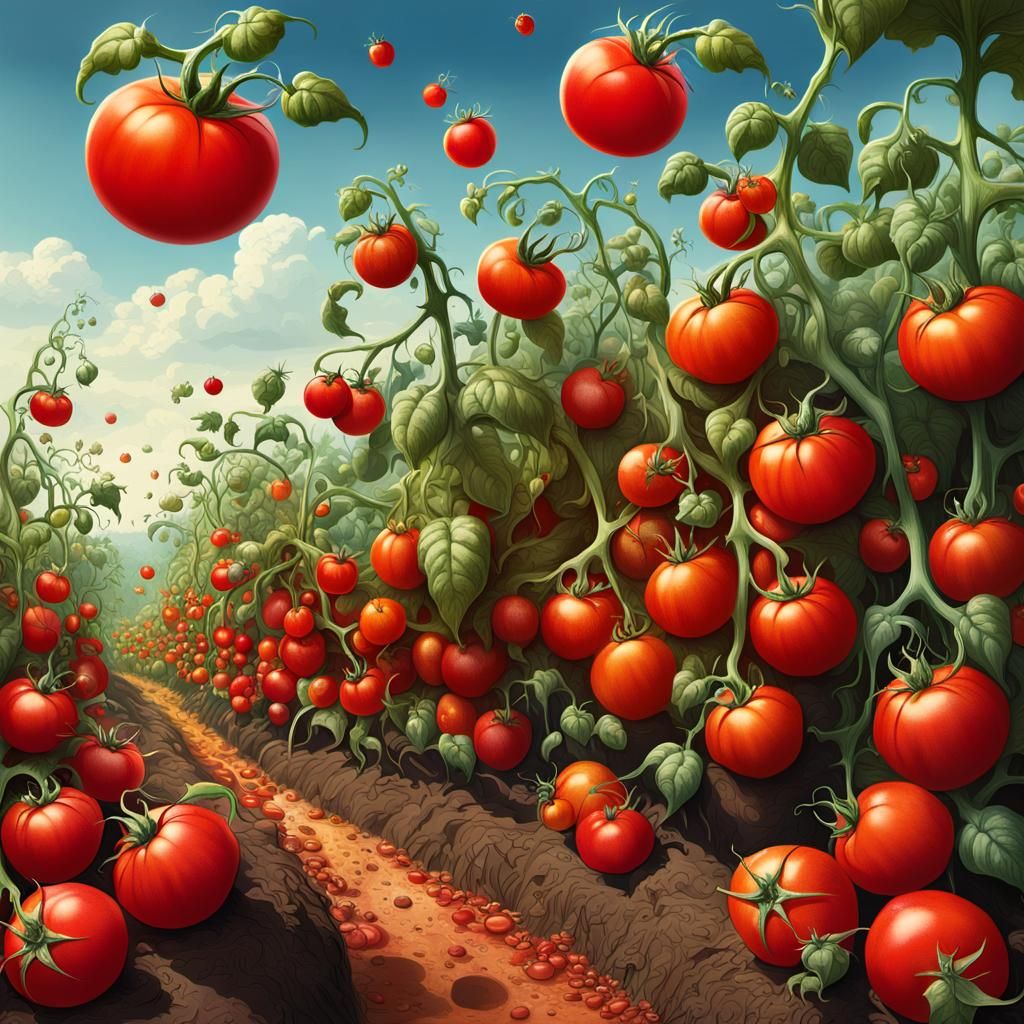 This image shows a whimsical tomato field populated with worms wearing colorful hats. The detailed matte painting showcases complementary colors and intricate details in a fantasy concept art style.