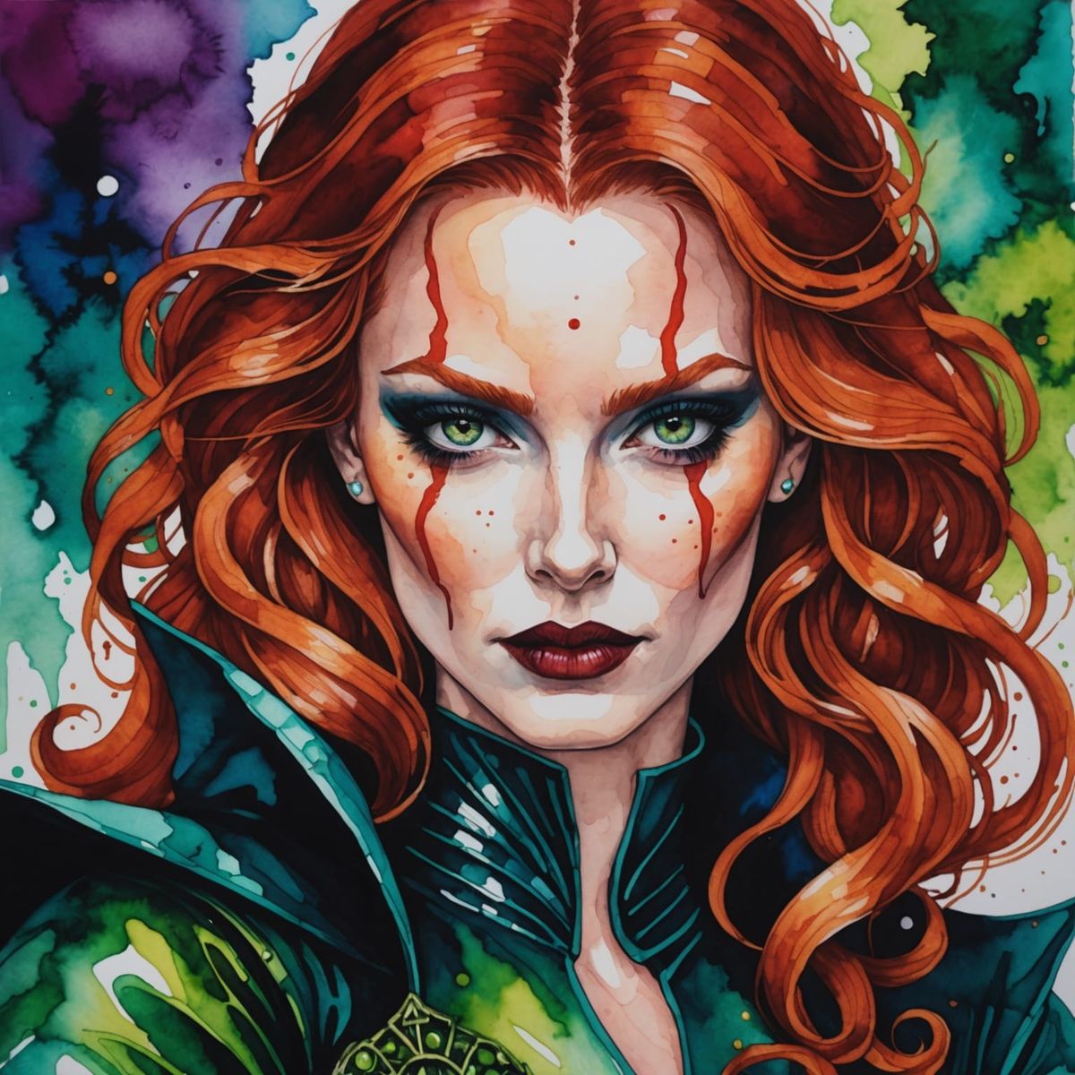 This image shows a beautiful red-haired villainess engaged in nefarious activities. The artwork is created with alcohol ink, giving it a vibrant and fluid aesthetic.