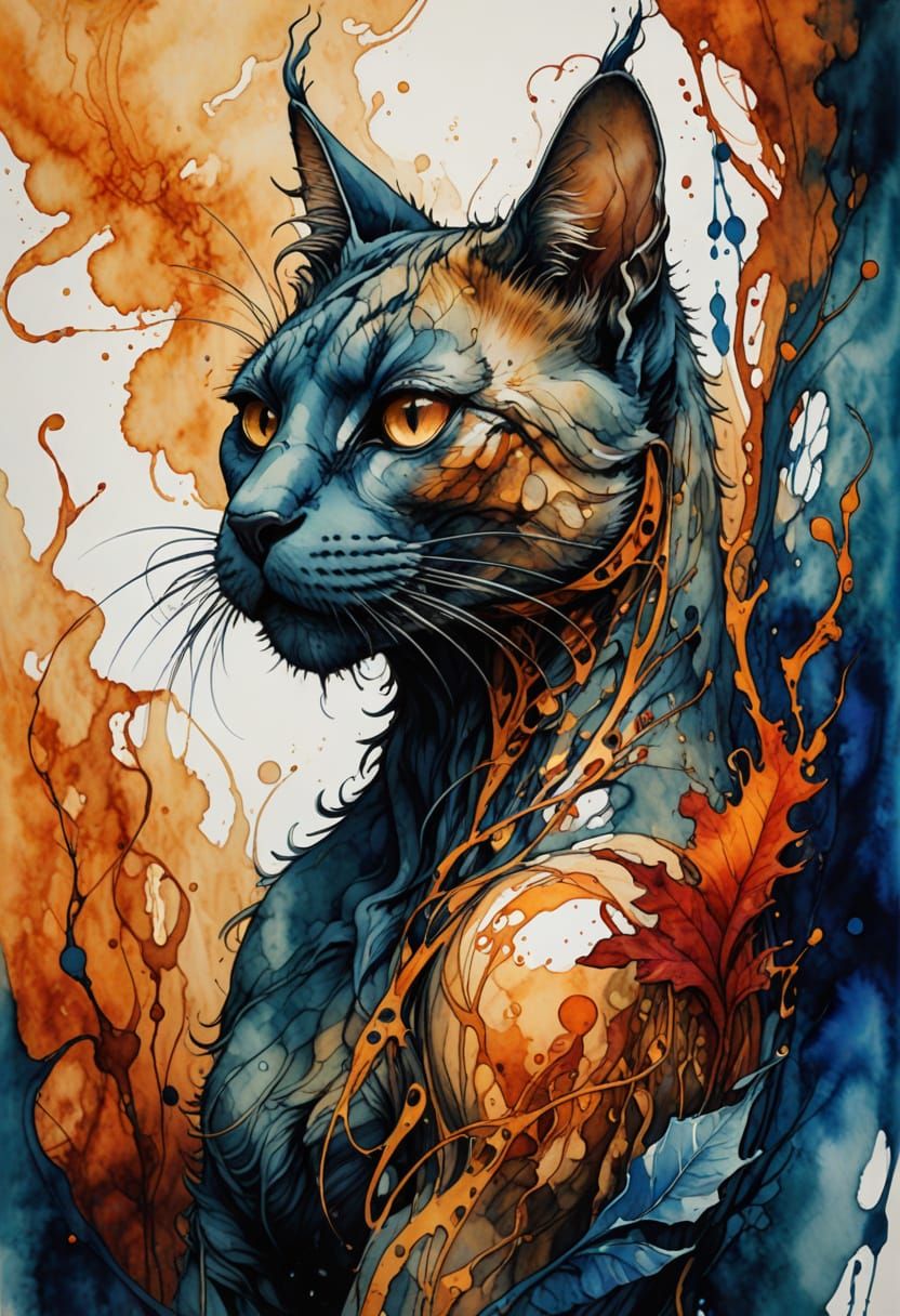 A surreal illustration of a slender cat with a long neck and tail in a mystical forest. The feline gargoyle features swirling lines and asymmetric patterns in shades of orange, red, gold and blue as fluid ink art.