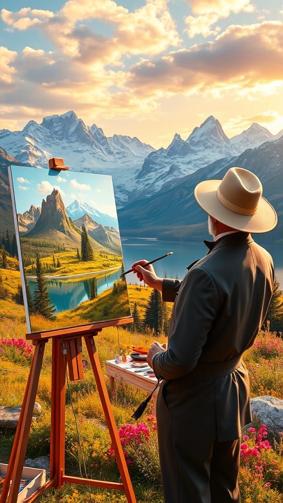 This serene oil painting captures a majestic mountain range, crystal-clear lake, and vibrant wildflower meadows, set against a warm golden hour sky, in a tranquil style reminiscent of classic landscape art