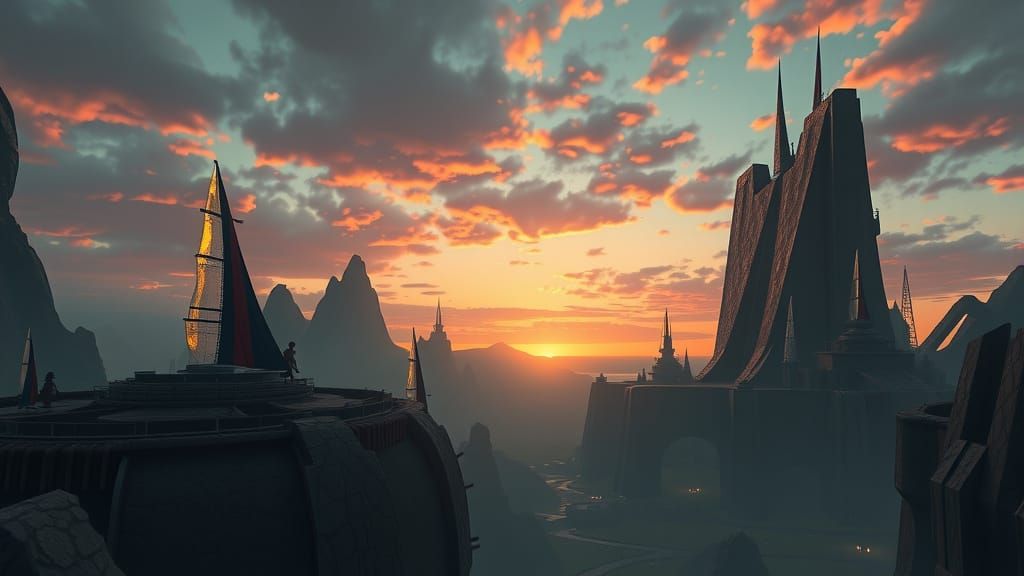 A painting of a fantastical dusk scene, created with intricate details and a deep, rich color palette, reminiscent of a Simon Stalenhag-inspired artwork, with high contrast and a touch of mystique.