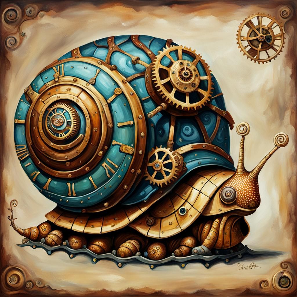 A digital painting of a snail automaton. The steampunk aesthetic combines Victorian style with clockwork elements to create a fantastical mechanical creature.