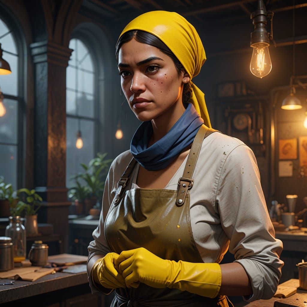 This image depicts a young woman, inspired by Alexandra Ocasio-Cortez, dressed in the worn attire of a charwoman, with a focus on vibrant, triadic colors and intricate details, showcasing dynamic lighting and high-resolution concept art.