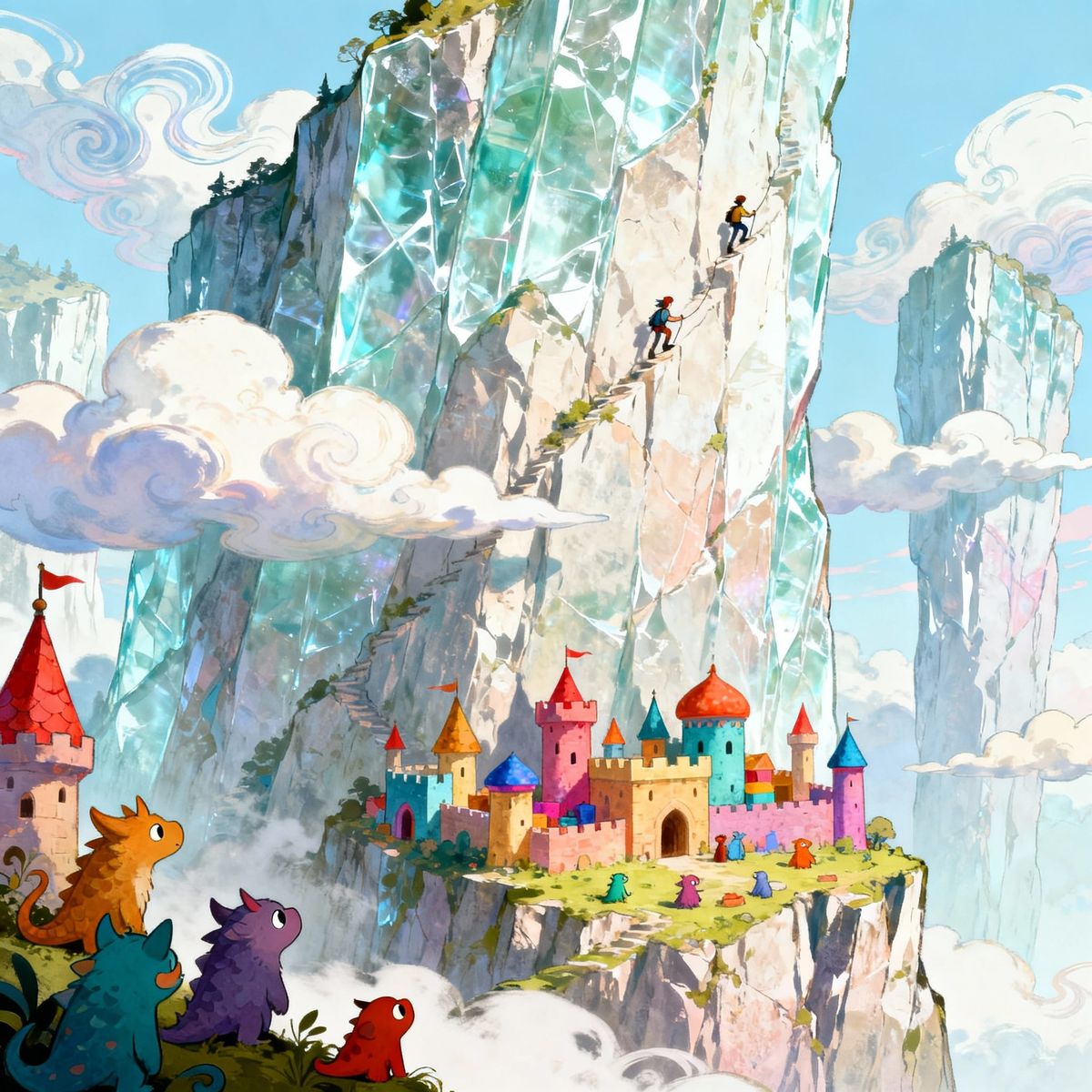 This image shows whimsical creatures building colorful castles on crystal-clear cliffs, with calm clouds overhead and climbers scaling the colossal heights.