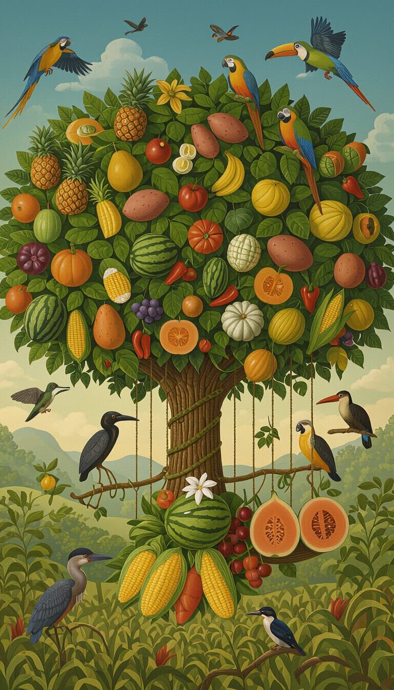 This image depicts a lush Kaliawirinae tree with diverse fruits, suspended by a vine. Parrots, macaws, and toucans adorn its branches, with various animals on the ground. Stylized human figures act as protectors in a vibrant, warm, naturalistic style with cinematic lighting.