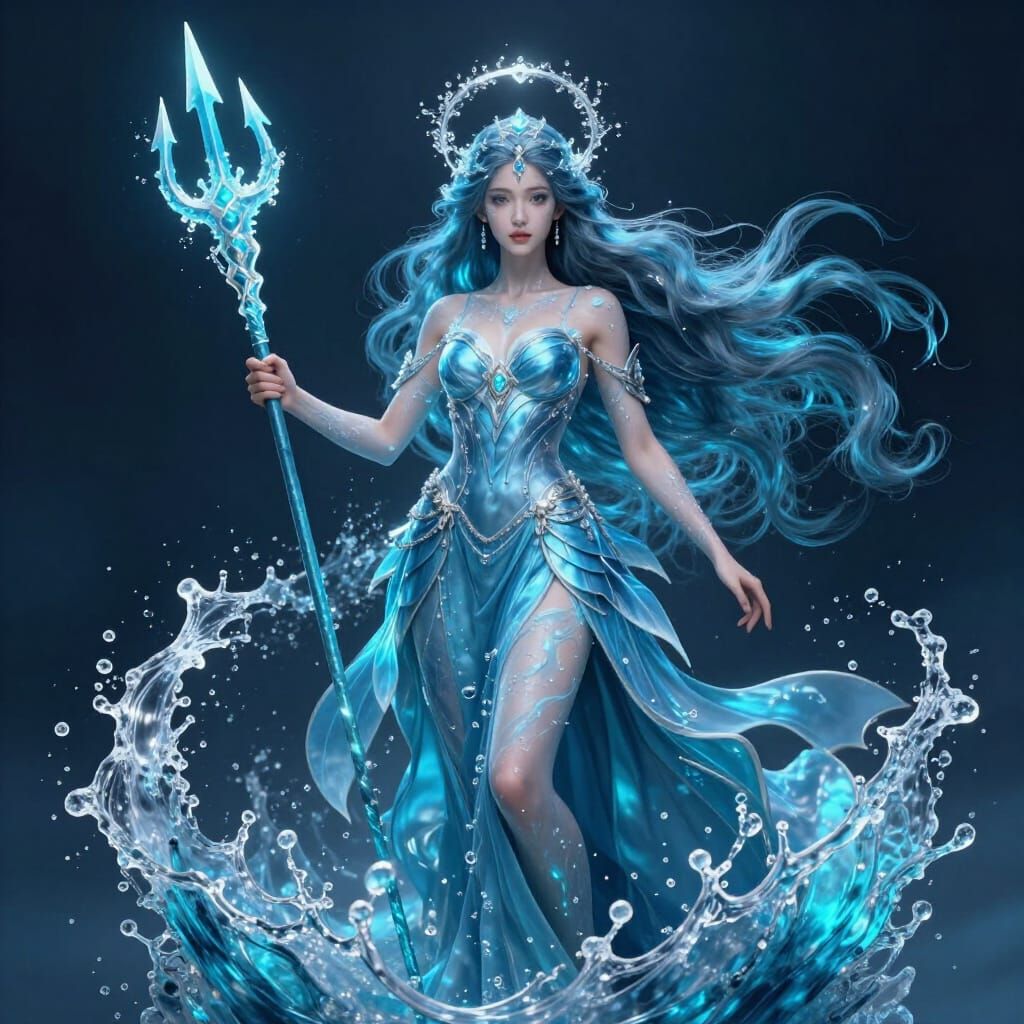 This detailed matte painting depicts an oceanic goddess with flowing water hair, a water halo, and fins. She wears a blue silk dress with water armor and wields a trident, surrounded by a tidal energy aura. Fantasy concept art.