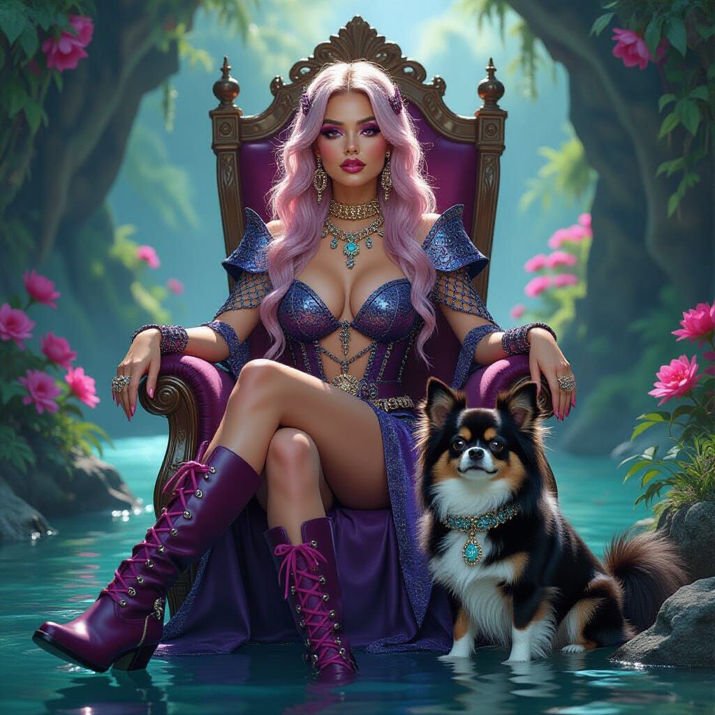 An image of an underground stream, foliage, vast pink flowers, . A sassy young woman, plum eyeshadow, glossy plum lips, with long flowy wind-swept dirty blond/pink hair, clad in blue/purple chainmail/velvet attire , tall suede boots with pink laces, statement jewelry, seated on a large throne chair by ...