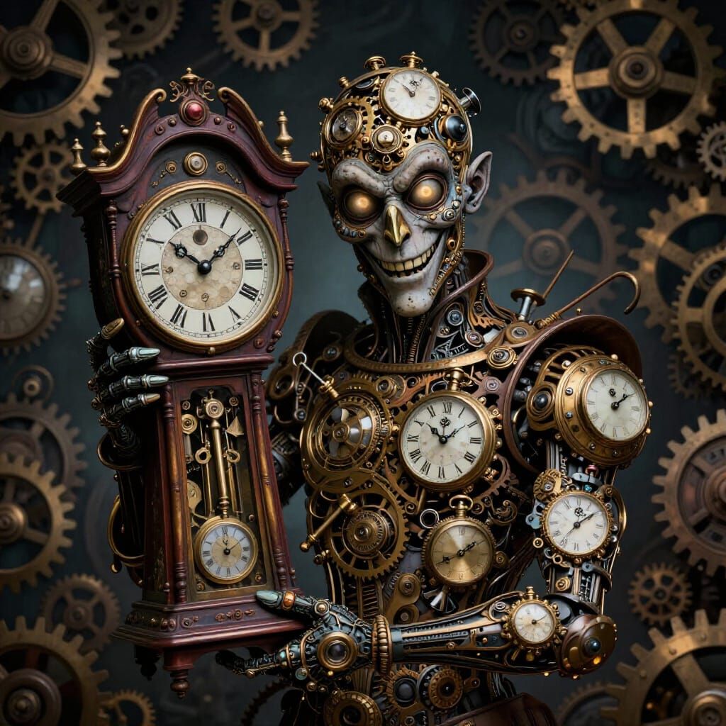 This image shows a surreal man made of clockwork and watches, holding a grandfather clock. The dark, detailed artwork features a swirling gear background and dramatic lighting, evoking a sense of unsettling surrealism.