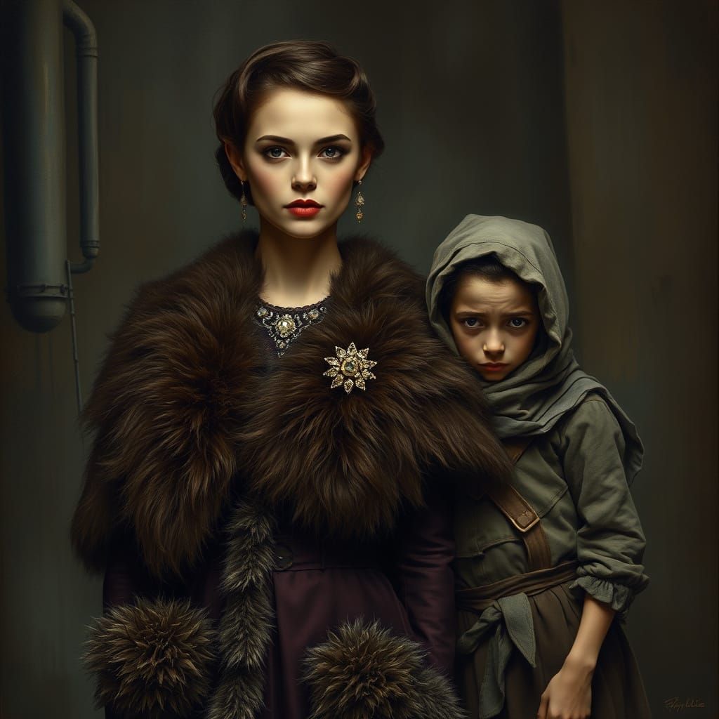 This image contrasts the opulence of a well-dressed woman with the desperation of a poverty-stricken girl, set against a gritty industrial backdrop, in a poignant and emotive style that blends the social commentary of Gustave DorΓ© with the moody lighting of Rembrandt and the textured illustration of Bill...