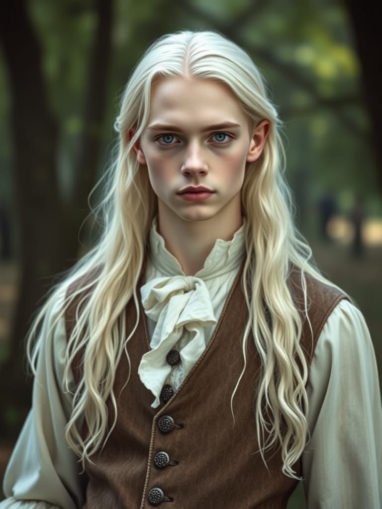 This image depicts a young man with white hair and eyes, dressed for a fantasy Spring Ball in a medieval style. Rendered with delicate detail and soft lighting, evoking pre-Raphaelite art.