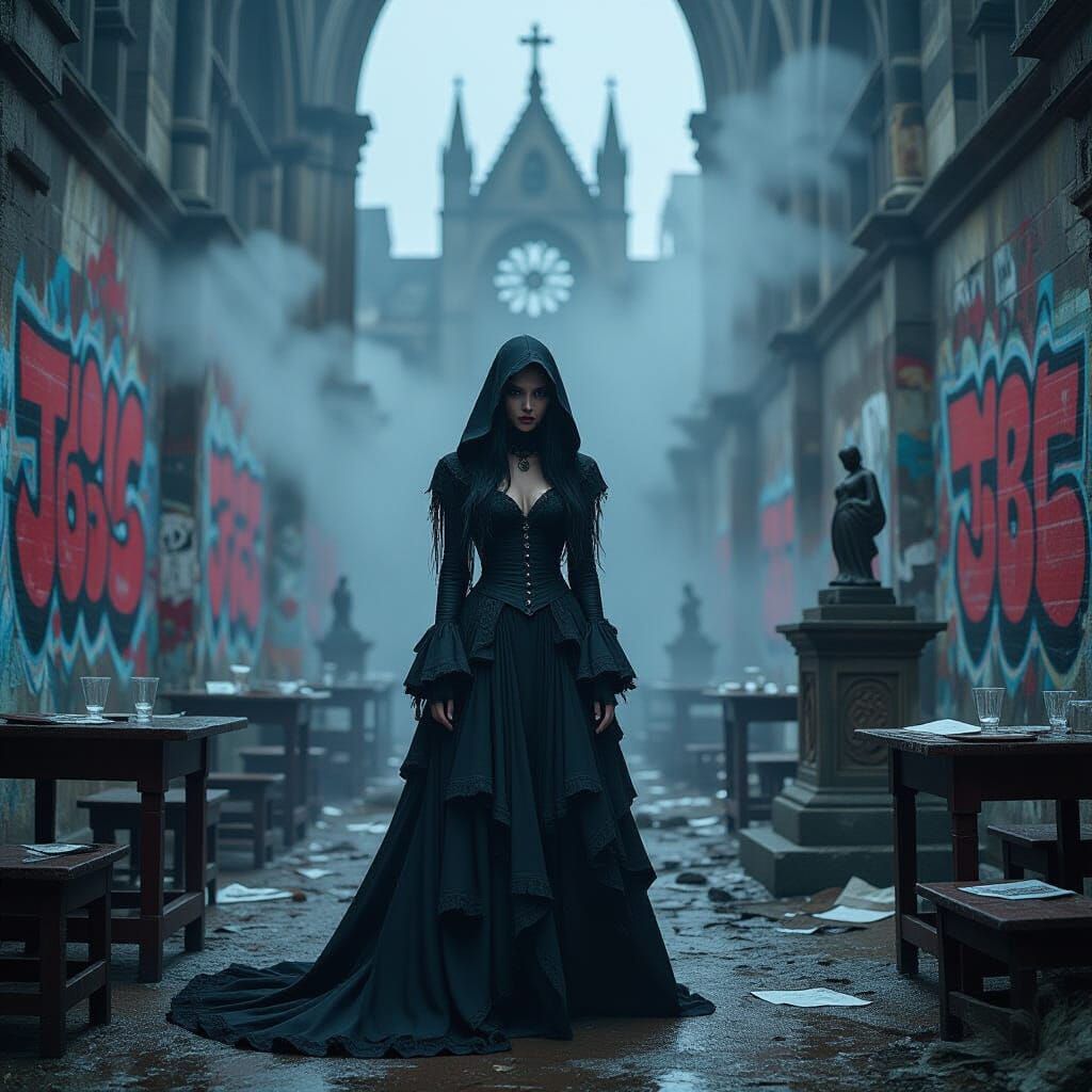 A striking picture shows a goth model in a ruined cathedral. The scene includes vibrant graffiti, iron sculptures, and fog, all rendered with grainy, black and white textures in a dark, moody aesthetic.
