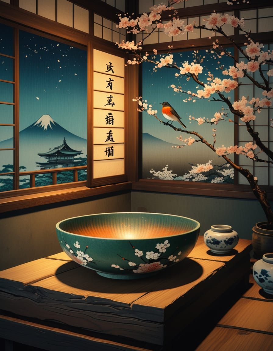 This Ukiyo-e style image features a robin beside a stone basin amidst cherry blossoms. Rendered with elegant lines, jade, burnt orange, and powder blue accents, it evokes a serene Japanese print.