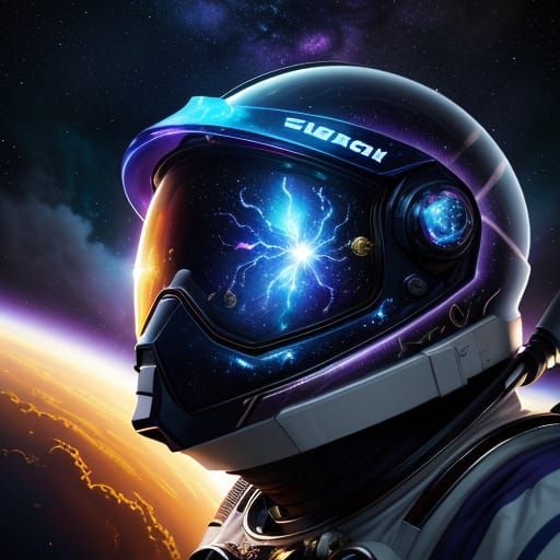 This image captures a surreal, hyper-realistic scene of an astronaut surrounded by glowing stars, swirling purple clouds, and neon lights reflecting off their helmet, set against a dynamic backdrop of golden hour and vibrant colors.