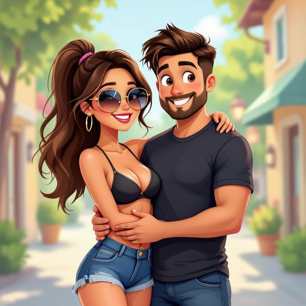 This vibrant illustration features a smiling woman with sunglasses and a man embracing her. The art style is inspired by Pixar and Disney, with clean lines and a warm, cozy atmosphere.