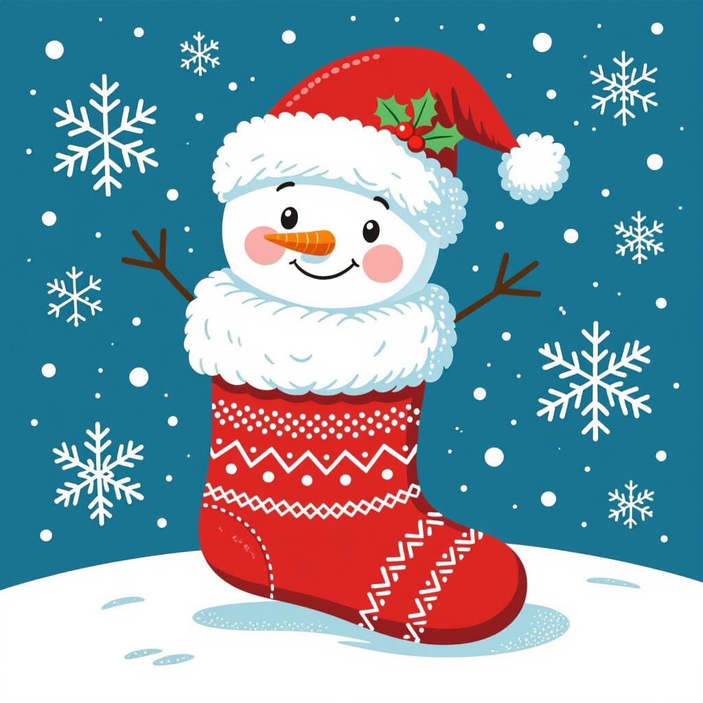 This image shows a charming cartoon snowman peeking from a festive red stocking. It features Scandinavian patterns and a Santa hat, rendered in bright, vivid colors with a whimsical aesthetic.