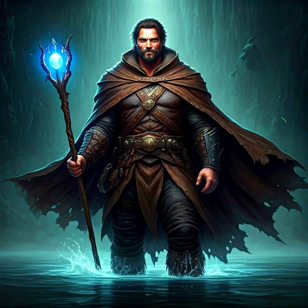 This image depicts a striking Dungeons and Dragons-inspired wizard, standing in a serene underwater environment. He wears a brown cape and carries a staff and sword, with intricate details and deep colors, evoking a sense of fantasy and mysticism.