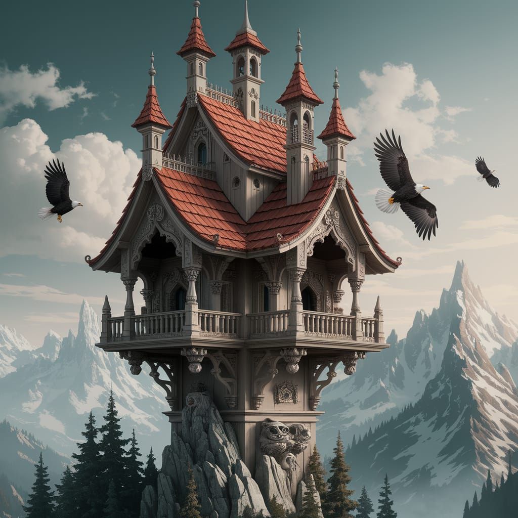 A fantasy gothic style image of a large, ornate wooden birdhouse perched high on a mountain, designed with minarets, turrets and gargoyles to house eagles.