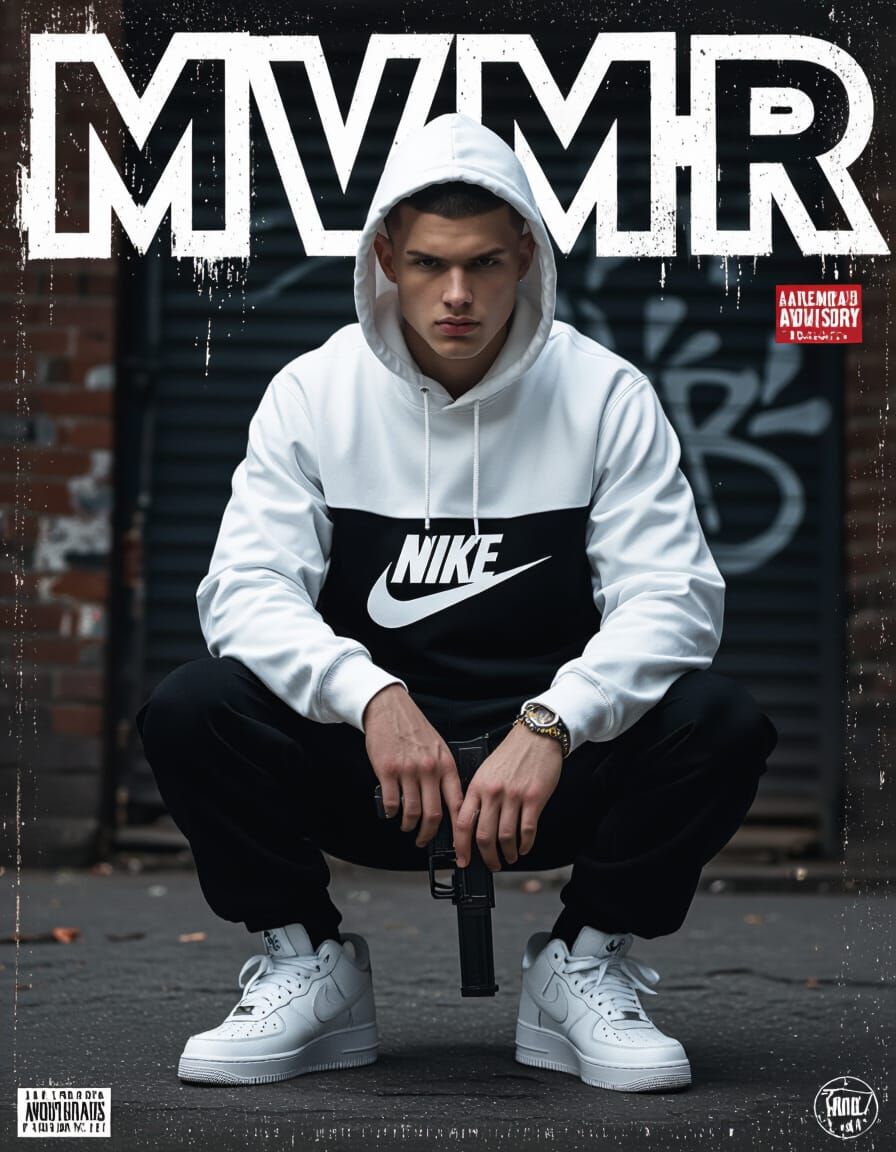 This image shows a young man in streetwear with a gun, set against a gritty urban backdrop. The artwork features bold typography and a street photography aesthetic.