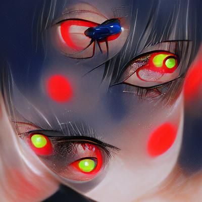 This image shows a close-up of a face with piercing red eyes. The image is stark and intense, focusing on the eyes as the central element.