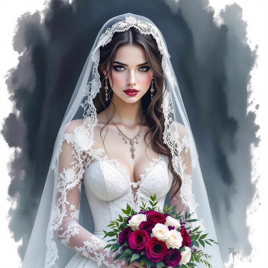 This image shows a gothic bride with radiant skin in a tattered lace gown. The artwork features expressive chalk strokes detailing her veil, jewelry and roses in a dark watercolor aesthetic.